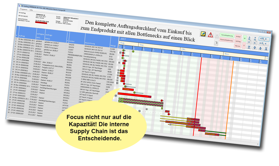 Hilfestellungen zur realistischen Kapazitätsplanung,  Vorschläge zur Reihenfolgebildung, Dringlichkeit und Abarbeitung, Überwachungsinstrumente zur termingerechten Produktion, Anzeige von drohenden Material- und Kapazitätsengpässen - lange bevor sie zur Realität werden.