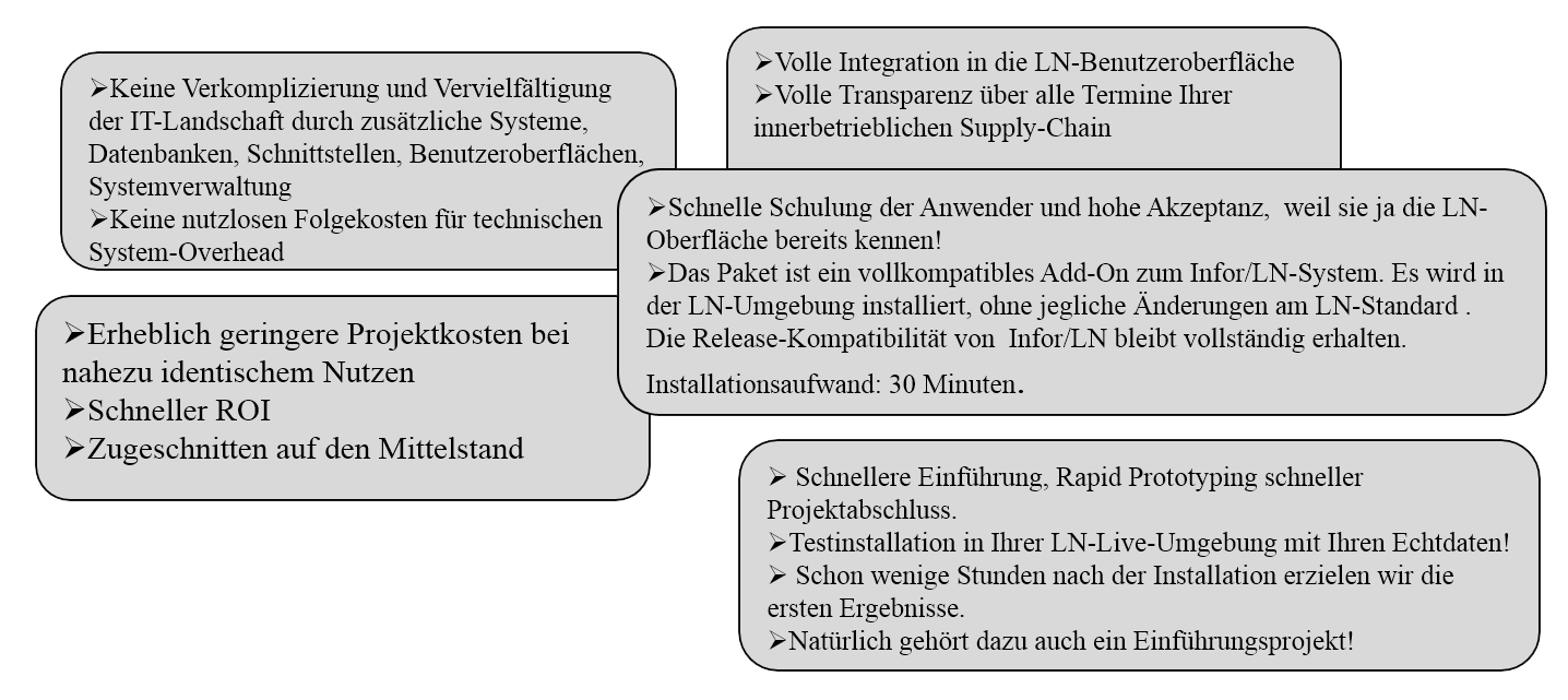 Im Gegensatz zu "angedockter Fremdsoftware" wie dediziertem Leitstand, externem APS oder MES-System erlaubt der ascon-Planner eine von Vertreib über Fertigung bis Einkauf durchgängige Ressourcenplanung und volle Termin- und Status-Tranzperenz INNERHALB der LN-Umgebung für alle Anwender.