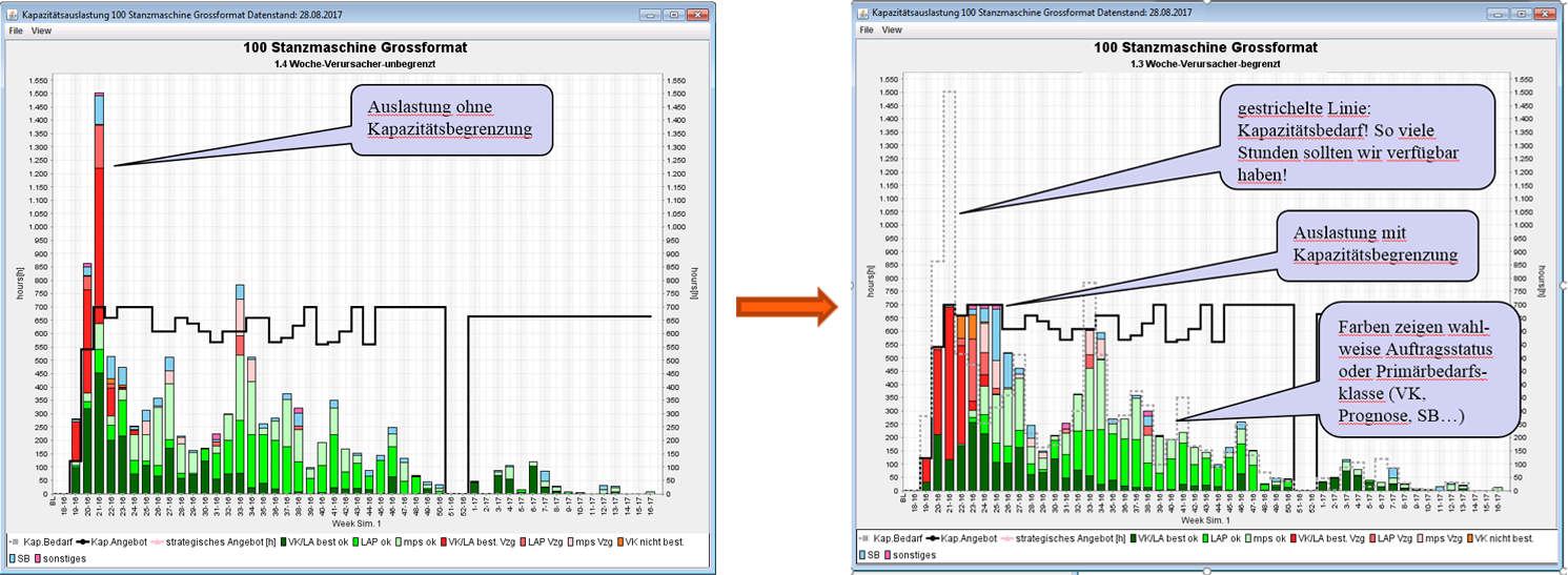 Gestrichelt eingezeichnet wird im Chart der eigentlich nötige Kapazitätsbedarf. So sieht der Fertigungssteurer, ob Zusatzarbeit nötig ist. Ein Blick auf das Chart „unbegrenzte Kapazität“ zeigt dann, welche Auftragsverursacher von Zusatzkapazität profitieren. Sind es nur Lageraufträge, lohnt sich die Zusatzschicht vielleicht nicht.